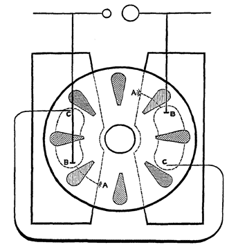 In April 1891 I had the honour to submit to this Meeting a very useful form of experimental Influence-machine, by means of which I was able to show that almost every combination of glass and metal, and also that plain glass disks, when moved and suitably touched, were capable of producing a flow of electricity. It is one of those combinations, somewhat modified and extended, which I have now the further pleasure of bringing to your notice. The machine consists of two disks of plate-glass, each of 3 ft. 5 in. diameter and ¼ inch thickness, mounted about ¾ inch apart on one boss and spindle. This spindle is driven by means of a handle, and the disks rotate in one direction. In the space between the disks are fitted four vertical slips of glass, two being situated on the right-hand side of the machine and two on the left-hand. The vertical edges of the slips which come nearest the spindle are cut to an angle, leaving a rather wider opening at the circumference than at the centre of the disk. Upon each slip is a brush, A, and also an inductor, the brush and the inductor being metallically connected; the brushes are made of fine wire, and touch very lightly on the inner surfaces of the disks. The glass slips slide into place by means of suitable grooves at their top and bottom ends; they may be removed and replaced readily at pleasure. The essential parts are fitted together within a glass case, and in all respects the machine is so constructed as to be useful for experimental work. The limited size of the case causes the insulating distances between part and part to be small, hence the length of the sparks is reduced. All the surfaces are coated with shellac, and when the brushes are new and in proper condition the machine is self-exciting. The charges are not subject to reversal when the terminals are opened beyond the striking distance, for then the whole of the induced charges pass by way of the neutralizing brushes C, C. Another feature is that the neutralizing current may also be broken without reducing the excitement, but then the charges alternate from positive to negative with each half revolution of the disks.